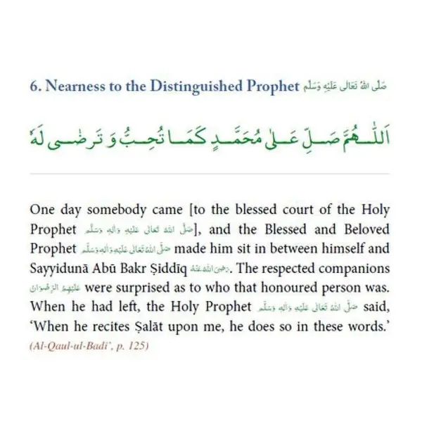 Allahumma salli ‘ala Seyyidina Muhammadin an Nabi al Oummiyyi wa ‘ala ali Seyyidina Muhammadin jazā Allahu Seyyidina Muhammadan, Salla Allahu ‘alayhi wa Sallam, ‘annā ma Huwa ahluhu, wa anzilhu al maq’ada al muqarraba ‘indaka yaoum al Qiyama, Wa bas’u al Maqam al Mahmood alladhi wa’adtahu, wa rzuqna shafa’atahu, innaka lā tukhlifu al mi’ad.