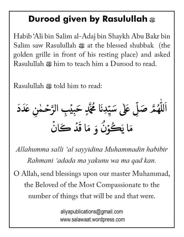 Allahumma salli wa sallim wa barik ‘ala Seyyidina Muhammadin as Sadiq al Masduq ﷺ, wa ‘ala ali Seyyidina Muhammadin ﷺ, as Siraj al munir ﷺ, al Qadam as Sidq ﷺ, Lisan al Haqq ﷺ, ar-Ruh al Qist ﷺ, nuru as samawati wal Ard ﷺ, bi ‘adadi kulli dharratin alfa alfa marrah, kama tuhibbu wa tarda lahu,