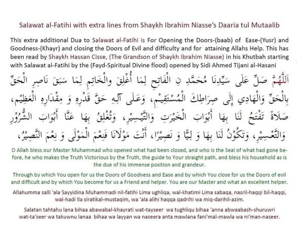 Allahumma salli ‘ala Seyyidina Muhammad al Fatihi lima oughliqa, wal khatimi lima sabaqa, nasiri al Haqq bil Haqq Wal Hadi ‘ila Siratika al Mustaqim wa ‘ala ālihi haqqa qadrihi wa miqdarihi al ‘azim salatan taftahu lana bihā abwaba al khayrati wat taysīr, wa tughliqu biha ‘ana abwaba ash shururi wat ta’sīri wa takunu lana bihā waliyyan wa nasīrān, Anta Mawlana fa ni’ma al Mawla wa ni’ma an Nasīr.