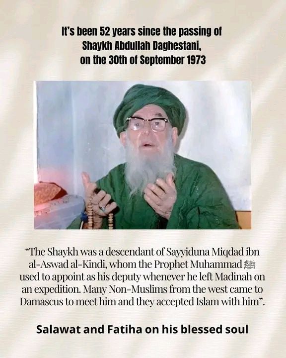 Mawlana Shaykh Abd Allah al Faïzi ad Daghestani, a’ala Allahu ta’ala darajatahu, est un descendant de Sayyidina Miqdad Ibn al Aswad al Kindi, celui que le Prophète Muhammad ﷺ avait l’habitude de prendre pour être son représentant quand il quittait Madinah pour une expédition.