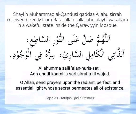Allahumma salli ‘ala an Nūri as sati’i, ad dhāti al kāmili as sārī sirruhu fil wujūd