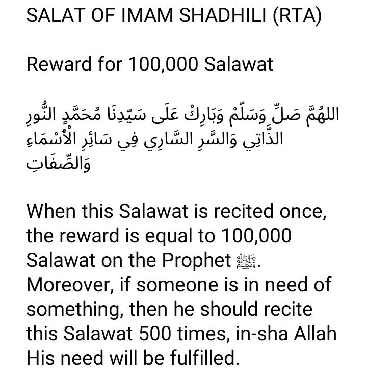 Cela se fait de la manière suivante : 1ère raka’at : sourate al-Fatihah, suivie de la sourate al-Ikhlas (Qul hu Allau ahad) 11 fois 2ème raka’at : sourate al-Fatihah, suivie de la sourate al-Ikhlas (Qul hu Allau ahad) 10 fois, et de la sourate al-Kafiroon, 3 fois 3e raka’at : Sourate al-Fatihah, suivie de la sourate al-Ikhlas (Qul hu Allau ahad) 10 fois, et de la sourate al-Takathur (Alha kumu takathur), 1 fois. La sourate al-Takathur est la sourate numéro 102. 4ème raka’at : Sourate al-Fatihah, suivie de la sourate al-Ikhlas (Qul hu Allau ahad) 15 fois, et Ayatul Kusi 1 fois. Faites ensuite don de la récompense spirituelle de l’accomplissement de cette prière à tous les ennemis qui auront une créance sur vous le jour du Jugement dernier. Ce solat doit être accompli en 7 occasions spécifiques : la première nuit de Rajab la nuit du milieu de Sha’ban (15 Sha’ban) le dernier vendredi du Ramadhan le jour de Idul Fitri (Hari Raya Puasa, 1er Syawal) le jour de Idul Adha (Hari Raya Haji, 10 Zulhijjah) le jour de Arafah (9 Zulhijjah) le jour de Ashura (10 Muharram) #daroodpakandprayers