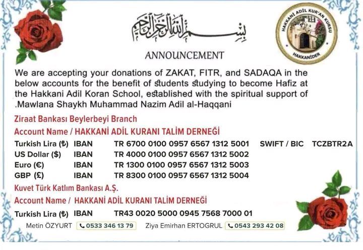 S’il vous plaît de soutenir les bonnes œuvres de Mawlana Shaykh Nazim al Haqqani Hz, Qaddas Allahu sirrahu. Vous trouverez ci-dessous les liens utiles: