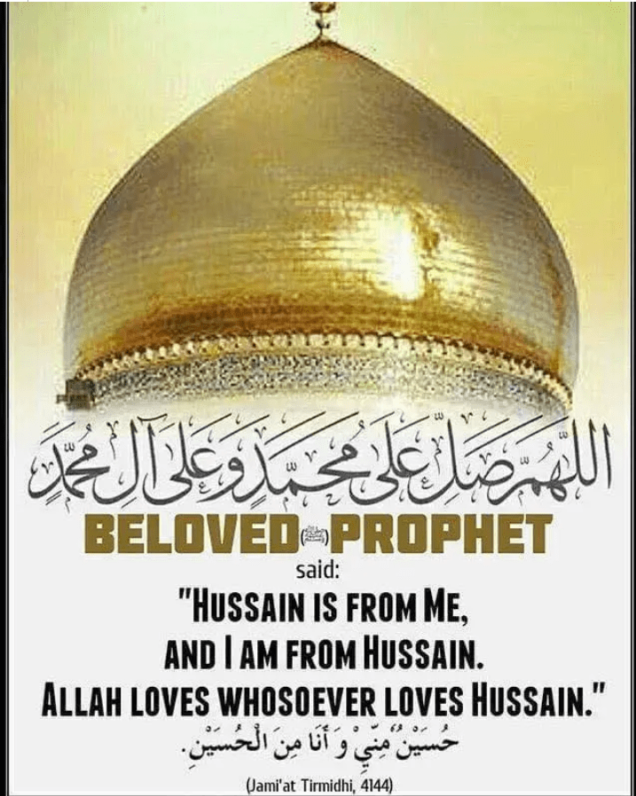 Selon Hazrat Abu Hurayra, le messager des hommes et des djinns utilisait des mots tels que : « En cherchant le vénérable Husayn assis dans sa noble Masjid, le Messager des hommes et des djinns utilisait des mots comme « Où est le petit bonhomme ? Le vénérable Husayn accourait immédiatement, s’asseyait sur les genoux de notre Maître, l’étreignait affectueusement, puis passait ses doigts dans la barbe bénie du noble Messager. Le roi des Anbiya embrassait alors le vénérable Husayn, en disant : « Ô mon Seigneur, j’aime cet enfant. Puisses-Tu également aimer mon Husayn et ceux qui l’aiment ».