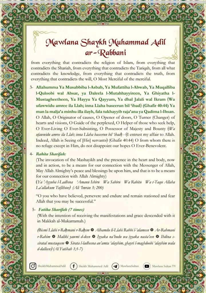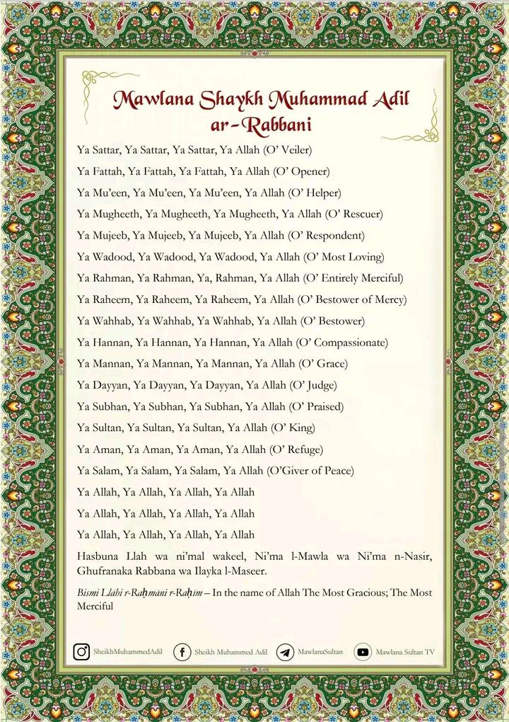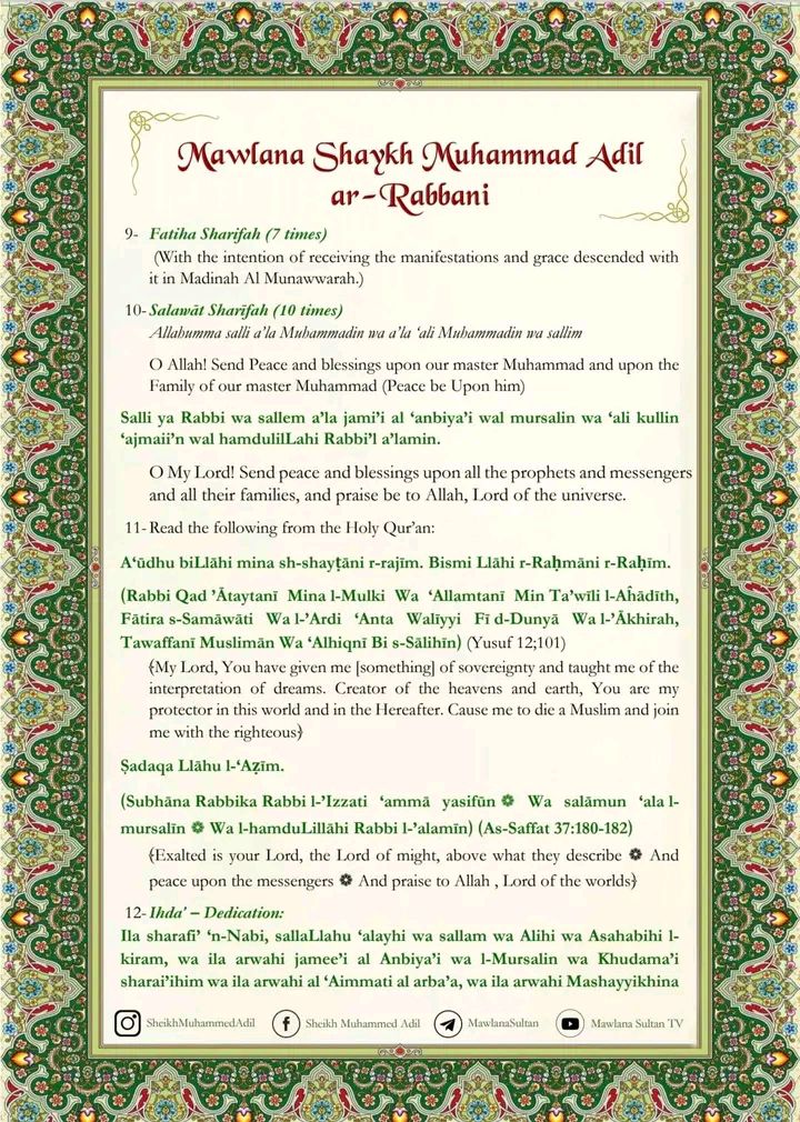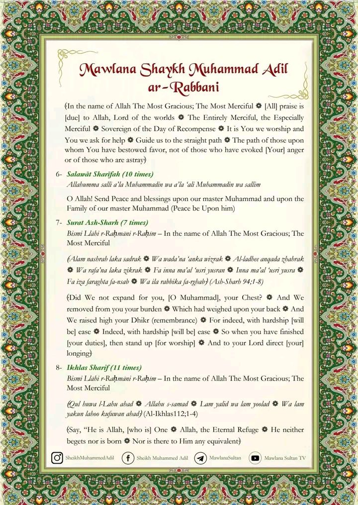 Grand-Cheikh a dit que lire ceci sur une personne malade les effacera et si vous le récitez sur vous-même avant de dormir, Allah ﷻ enverra ru’ya saliha et vous serez sous Ses soins cette nuit-là et votre âme sera en sajda sous l’Arsh Ar- Rahman.